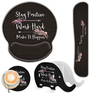 Keyboard Wrist Rest and Ergonomic Mouse Pad with Wrist Support Set,Non-Slip PU Base,Matching Cute Coaster and Multifunction Removable Elephant Pen Holder,Stay Positive Work Hard and Make It Happen