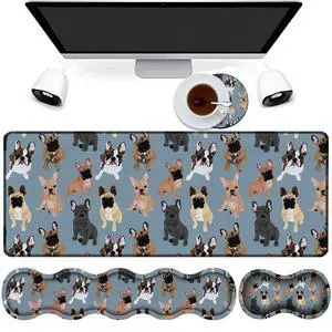 4 in 1 Mouse Pad Combo, Large Gaming Mouse Pad + Keyboard Support + Mouse Rest + Coaster, Table Pad with Stitched Edge Memory Foam Ergonomic Wrist Pad Set, French Bulldogs