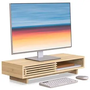 WELL WENG Monitor Stand Riser with Sliding Door, Computer Laptop Stand Desk Shelf Organizer with Storage (Natural Bamboo, 25 Inch)