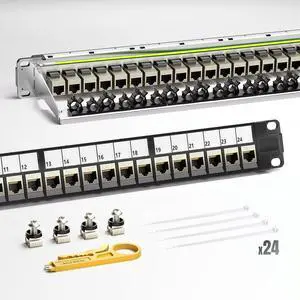 AMPCOM CAT7 Keystone Patch Panel 24-Port 1U with 10G Shielded Ethernet Inline Coupler - 19 Inch Rackmount &Wall Mount with Rear Support Bar