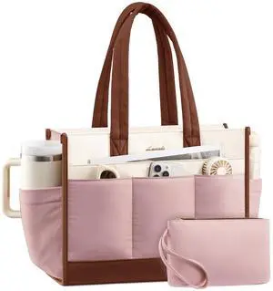 LOVEVOOK Tote Bag for Women, Puffer Laptop Handbag Work Purse 15.6 Inch for Teacher Nurse, Large Quilted Travel Tote Shoulder Bag with Zipper for College Office Clinical Gym, Cream-pink