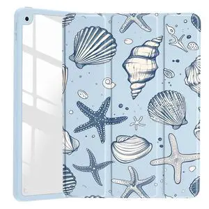 JOYLAND Sea Shells Case for iPad 7th/8th/9th Generation, Clear Transparent Acrylic Hard Back Ice Blue Case with Pencil Holder Trifold Stand Tablet Cover for iPad 10.2" 2019/2020/2021