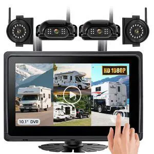 WOOCARTY 10.1" - 4 Wireless RV Backup Camera System, 1080P DVR Touch Screen Rear Side Cameras for Monitoring, Compatible with Furrion Pre-Wired Plug, Clear Night Vision Camera for Trailer Truck, A24