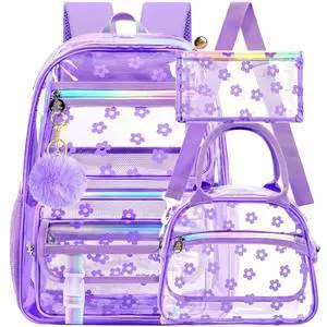 UFNDC 3PCS See Through Backpack, Girls Plum Blossom Purple Clear Bookbag Heavy Duty, Transparent PVC School Bag