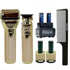 BaByliss Pro FXONE GOLDFX Limited Edition Prepack - Outlining Trimmer and Double Foil Stick Shaver (Gold) FX1FSTGPK with FXONE Dual-Charging Prepack FXC2BPPK and Comb