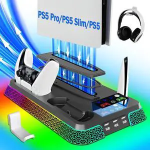 PS5 multifunctional Cooling Stand with Charging Station and Suction Cooling Fan, Dual Controller Wireless Charger Station, Charging Dock Station and Game Slots