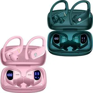 bmani 2 Sets Wireless Earbuds Bluetooth Headphones 48hrs Play Back Sport Earphones with LED Display Over-Ear Buds with Earhooks Built-in Mic Headset for Workout Pink+Green