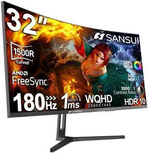 SANSUI 32-Inch Curved Gaming Monitor WQHD 2560 x 1440 180Hz Curved 1500R -1ms(OD), HDR, 300nits, sRGB 125%, DCI-P3 95%, FreeSync, HDMI x2, DP1.2x2(ES-G32C3 DP Cable Included)
