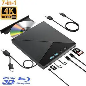 External Blu Ray CD DVD Drive, [7 in 1] USB 3.0 Type-C 3D Blu-ray DVD Burner Slim Optical External Bluray DVD Burner with SD/TF Card Slot 2 USB 3.0 & 2 Type-C Ports for Laptop PC Windows Linux MacOS