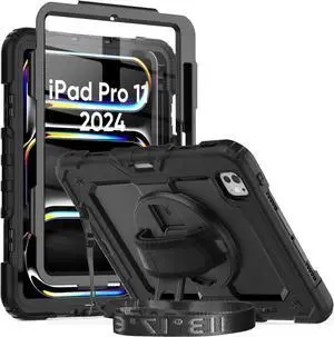 JAENFONG Case for 2024 iPad Pro 11-Inch M4 (2024, 5th Gen), 3 Layer Hybrid Shockproof Rugged Protective Case with 360° Rotating Stand - Hand Strap - Shoulder Strap - Pencil Holder,Black
