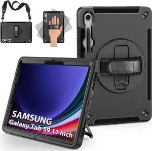 JAENFONG Case for Galaxy Tab S9/S9FE 5G 2023, Military Grade Heavy Duty Shockproof Case for Galaxy Tab S9 11 inch with Hand/Shoulder Strap Rotating Kickstand, Black