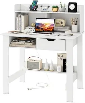 Tangkula White Desk with Hutch & Drawer, Modern Computer Desk with Charging Station USB & Type C Port, Cable Hole, Home Office Desk with Storage Shelves for Study Room Bedroom