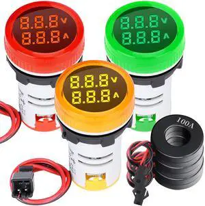 AC Volt Amp Meter, 3pcs AC 60-500V 100A Voltage Current Monitor Digital LED Display Voltmeter 110v 220v Volt Detetor Green Red Yellow Signal Indicator Light Panel