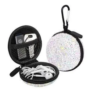 Earphone Case Earbuds Small Carrying Cases Bling Rhinestone Crystal Portable Headphone Organizer Storage Pouch Bag with Carabiner 1 Pack (White)