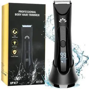 Groin & Body Hair Trimmer for Men, IPX7 Waterproof Pubic Hair Trimmer for Men - Ball Trimmer/Shaver with LED Light, Ceramic Blade, USB Rechargeable & Travel Pouch