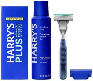 Harry's Plus Trial Shaving Kit for Men - Premium Handle, Razor Blade Cartridge, Foaming Shave Gel, and Travel Blade Cover - Advanced Pivoting System - Tide