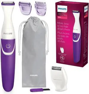 • Features: 2 click-on combs included to trim hairs to 3/ 5 mm length. Play with lengths! Click-on the trimming comb (3/5mm) to the trimming head and precisely trim your hair at 3/5 mm length. Bikini trimming head precisely trims down hairs to 0.5 mm. For an even groomed look, the bikini trimming head trims down the hair to 0.5 mm. Mini shaving head included for a clean look after trimming. Beautifully bare in some bikini areas? After using the trimming head, use the mini shaving head for a beautifully bare shave. Round teeth effectively cut hairs while protecting the skin. Rounded hair removal cutting teeth work their magic so you can safely and effectively trim your bikini line. No nicks or cuts. Washable trimming head for optimal hygiene Washable head for extra hygiene and easy cleaning. Battery powered for optimal portability. No need for charg...