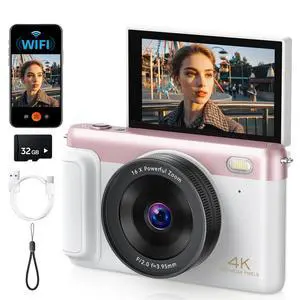 4K Digital Camera for Photography, 64MP Compact Vlogging Camera with WiFi and 3" 180° Flip Screen, 18X Digital Zoom, Ideal for YouTube Creators, Includes 2 Batteries & 32GB Micro SD Card, Pink