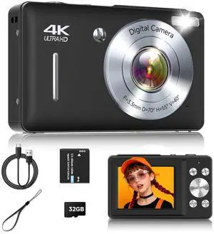 Small Digital 44MP Point and Shoot Compact Camera with 32GB SD Card, Two Batteries, Lanyard, FHD 1080P, 16X Zoom for Kids Boys Girls, Black