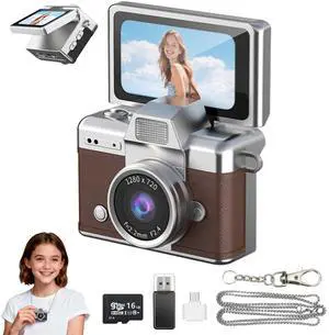 Mini Keychain Camera, 1.47" IPS Flip Screen Retro Digital Camera Pocket-Sized with Adapter and 16GB Card 6 Retro Filters Video Recorder with Long Battery Life for Travel, Party and Vlog (Brown)