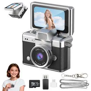 Mini Keychain Camera, 1.47" IPS Flip Screen Retro Digital Camera Pocket-Sized with Adapter and 16GB Card 6 Retro Filters Video Recorder with Long Battery Life for Travel, Party and Vlog (White)