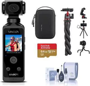 Minolta MN4KP1 4K Ultra HD Wi-Fi Enabled Pocket Camcorder, Black Bundle with 64GB microSD Card, Carrying Case, Octopus Tripod, Cleaning Kit