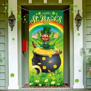 Door Cover, Lucky Green Shamrocks Spring Rainbow Backdrop Hat Leprechaun Gold Coin Pot Background Banner for Irish Holiday Party Decoration Supplies