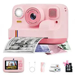 Instant Print Camera for Kids, Christmas Birthday Gifts for Girls Boys Age 3-15, 1080P Selfie Portable Digital Video Camera with 32GB SD Card, 3-Colored Print Paper- Pink