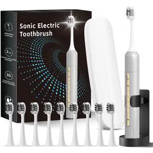 Lumivoid Sonic Electric Toothbrush for Adults & Kids - 10 Brush Heads, 90-Day Battery, 5 Modes, 2-Min Timer, IPX8 Waterproof, Rechargeable & Travel-Friendly (Silver)
