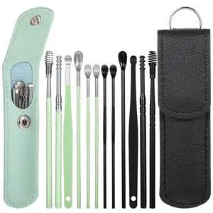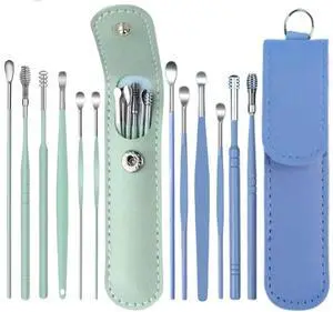 12 Pcs Ear Pick Earwax Removal Kit, Ear Cleaning Tool, Stainless Steel Earwax Removal Tool with Leather Storage Box (Blue&Green)