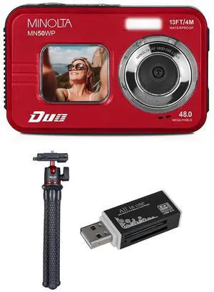 Minolta MN40WP 48MP QHD Dual LCD Screen Waterproof Camera, Red with accessory kit