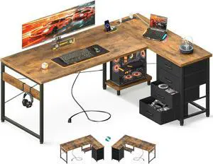 47" Computer Desk with File Cabinet and Power Outlets, Home Office Desk with 2 Monitor Stands and Storage Drawer, Writing Gaming Table with Shelves and 2 Hooks for Bedroom, Rustic Brown