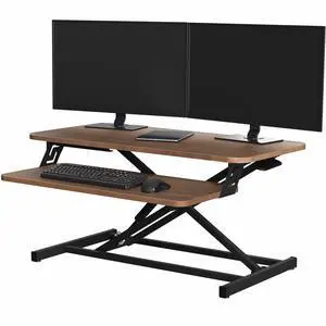 Mount-It! Height Adjustable Stand Up Desk Converter, 38 Wide Tabletop Standing Desk Riser with Gas Spring Desktop Standing Desk with Keyboard Tray Fits Two Monitors, Dark Walnut