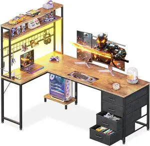 L Shaped Gaming Desk, Reversible U Shaped Computer Desk with Power Outlet and Storage Shelves, Gaming Desk with LED Strip, 3 Fabric Drawers, Black