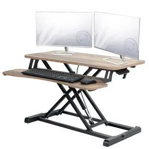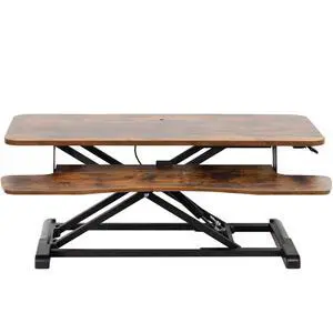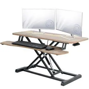46" Standing Desk Converter Large - Height Adjustable Sit Standup Triple Monitor Riser - Gas Spring Computer Workstation, Retractable Keyboard Tray - Teak Wood Grain