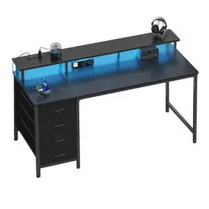 Computer Desk with 4 Drawers,4 Drawer Gaming Desk with with Power Outlets and LED Lights,Office Desk for Small Spaces with Monitor Shelf,Writing Desk for Home Office, Bedroom,Study 39 Inch Black