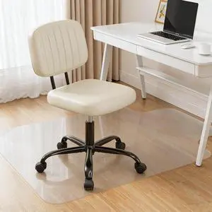 Features: Protects floors from chair caster scratches, Water-resistant to prevent spills, Anti-slip texture for safety, Flat design with anti-curling tech, Key-shaped for ergonomics, Compatible with up to 0.2" carpet with underlay, Durable PVC minimizes wear, Semi-translucent design blends with office space, Conceals wires and prevents slips, Bobbled surface for stability on