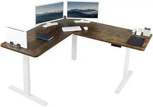 VIVO Electric Stand Up Corner Desk, Rustic Vintage Brown Table Tops, White Frame