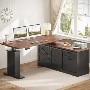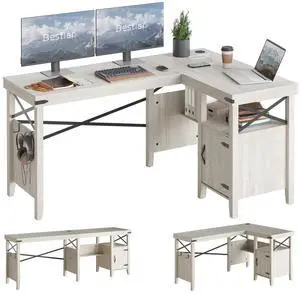 Bestier Farmhouse Desk 60" L-Shaped Computer Desk with Cabinet for Home Office , Wash White