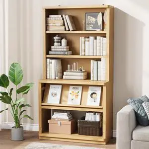 Rresyet 5 Tier Bookcase with Flip-Flop Design, 71" x 37" x 16" Wooden Bookshelf, Extra Book Shelf Storage Organizer, Bookshelves for Home Office, Living Room, Study Room (Wood)