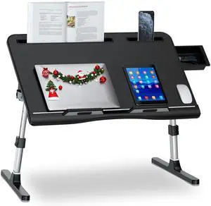Laptop Bed Desk, X-Large Leather Adjustable Computer Bed Table Tray, Foldable Laptop Lap Desk for Bed Sofa Couch Floor Writing Eating Working with Drawer 2 Movable Stoppers (23.6 inch, Black)