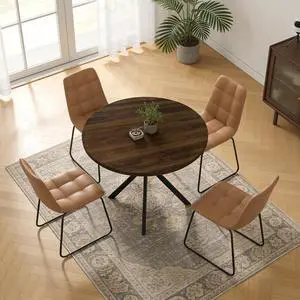 43.4 Inch Round Dining Table Set for 4, Mid Century Modern MDF Coffee Set for Dining Room Kitchen Apartment Walnut Table + 4 Brown Chairs