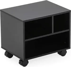 FITUEYES Mobile Printer Stand with Storage, Under Desk Black Wood Small Rolling Printer Table Work Cart with Wheels and 3 Compartment Organizer Spaces for Home Office, 15.7 x 11.8 x 13.8