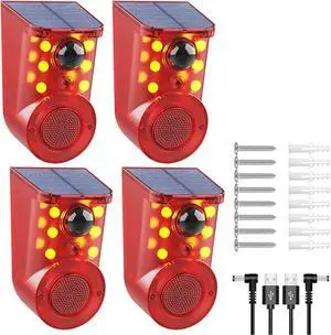 ChunHee Solar Outdoor Motion Sensor Alarm 3 Working Mode Motion Activated Alarm 120dB Loud Sound Noise Maker IP65 Waterproof Motion Detector with Strobe Light for Yard Farm Garden (4PC)
