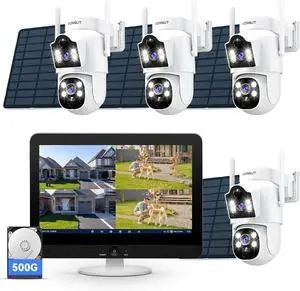 Solar Camera Outdoor Wireless, 2pcs 4MP+ 4MP Dual Lens Solar Cameras for Home Security System with 12'' Monitor 16CH NVR, 360° PTZ, 2.4G/5G WiFi, Human Detection, Color Night Vision, 500G HDD