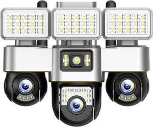V380 Triple Lens WiFi Security Camera 15MP Floodlight House Surveillance Cameras Night Vision CCTV Cam PTZ APP Control(US Plug,WiFi Cam Add 64G)