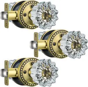 3 Pack Glass Crystal Door Knobs Interior, Antique Brass Crystal Door Knobs with Lock for Privacy Use, Vintage Crystal Glass Doorknobs for Bedroom Bathroom Interior Doors