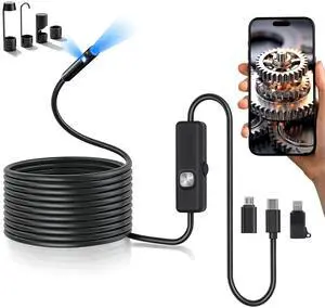 Endoscope Camera with Light,16.4ft Dual-Lens Borescope Tools with 8 Adjustable LED Lights, Endoscope with Semi-Rigid Snake Camera, IP67 Waterproof Inspection Borescope for iOS and AndroidBrand: AdventPart Number: Phone Endoscope CameraType: Audio & Power CableSpecifications: Phone Endoscope Camera, COOVIE, CMOS, 1080p, 2 megapixels, png, waterproof, 1 year warranty, Endoscope Camera with Light, 3.81 L x 12.192 W x 12.192 H centimetersModel #: 244354722411