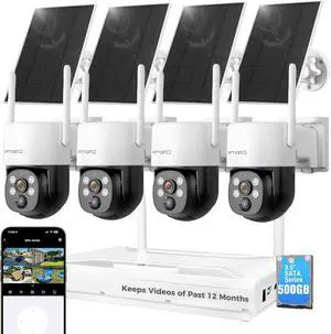 XMARTO Solar Camera Outdoor Wireless, 4 PCs QHD 4MP Wireless PTZ Security Camera System with 4K 10CH Expandable WiFi NVR, All-Weather Solar Charge, Two-Way Audio, PIR Sensor, No Monthly Fee, 500GB