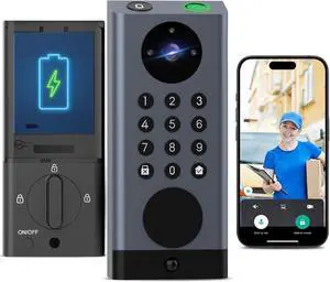 Smart Door Lock with Camera Deadbolt with Video Doorbell PIR Motion Detection Front Door Lock with Fingerprint Keypad Code Long-Lasting Battery Built-in Wi-Fi No hub Required No Drilling